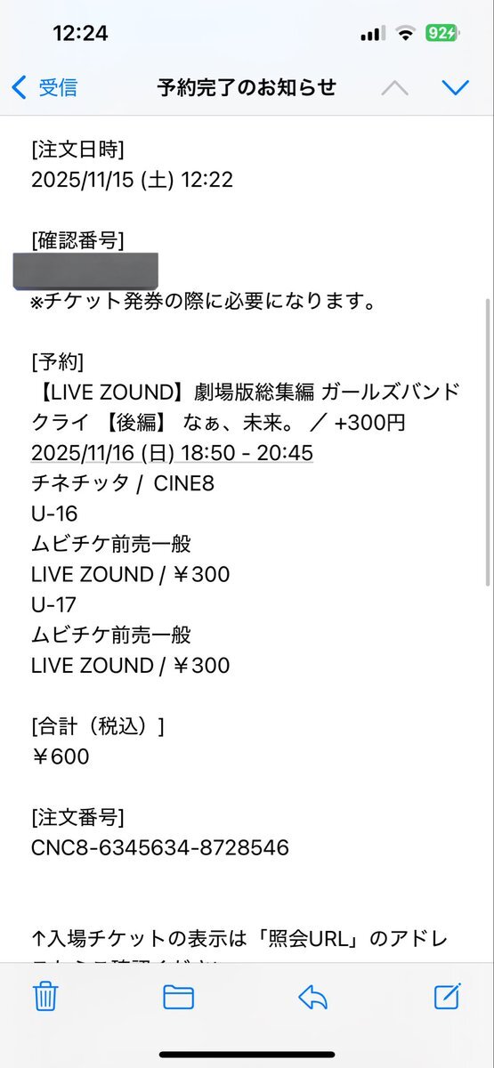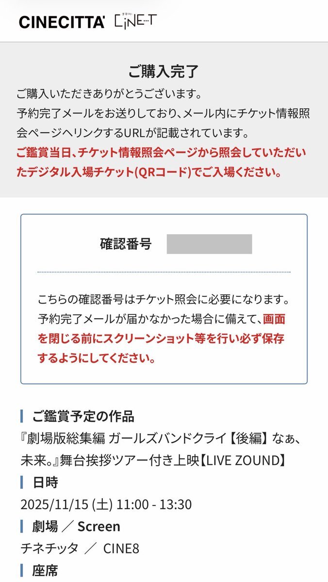 15日(土)のチネチッタ、確保しました🎥 00:00になったとたん、サイトが重くなって、ちょ〜あせりました。 A列は全部埋まってたので、B列を確保。 もしかして、A列はマスコミ席かもしれません。 #トゲナシトゲアリ #ガルクラ #劇場版総集編 #舞台挨拶 pic.x.com/LhwIvgmpLy