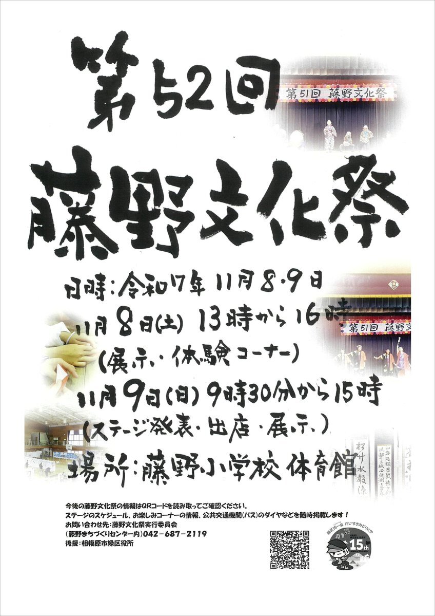 藤野イベント情報  11/8(土)、9(日) 第52回藤野文化祭 相模原市立藤野小学校 体育館 8日(土) 13:00~16:00 展示体験コーナー 9日(日)  9:30~15:00 ステージ・出店・展示 #露天風呂 #藤野 #藤野やまなみ温泉 #日帰り温泉 #美肌の湯 #源泉100パーセント #加水無し pic.x.com/tDIIEQbyeZ