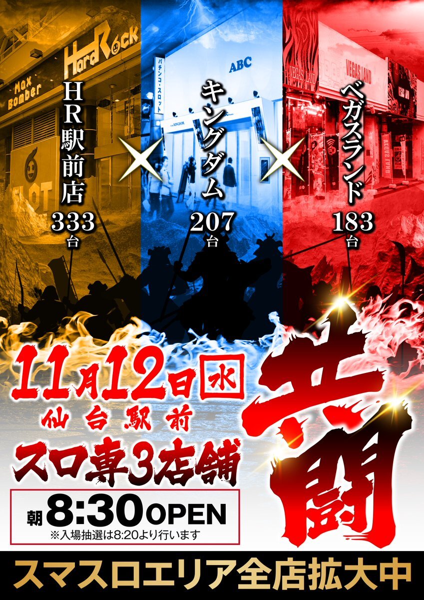 おはようございます!! 本日11月12日(水) 朝8時30分開店!! 入場抽選は8時20分開始ッ!! 昨日は強風で色んなものが 飛んでいましたが、 何かの看板には命の危機を感じました!! お気を付けください!! 強風でも安心の立体駐車場完備!! ご来店お待ちしてます!! #仙台 #スロット #加熱式タバコ喫煙可 pic.x.com/peVSY2qtyS