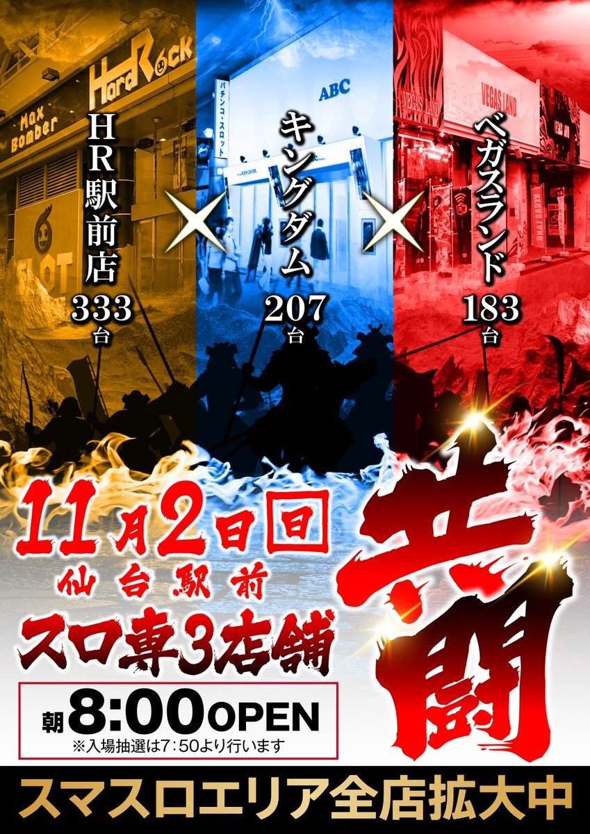 おはようございます!! 三連休ロック!!2日目!! 本日11月2日(日) 朝8時開店!! 入場抽選は7時50分より!! ドラクエウォークの イベント中だそうです!! ポケモンGOでもありましたが 仙台、人気ですね!! スロットは是非当店へ!! ご来店お待ちしてます!! #スロット #無料駐車場 #加熱式タバコ喫煙可 pic.x.com/ePGTf2lWJx