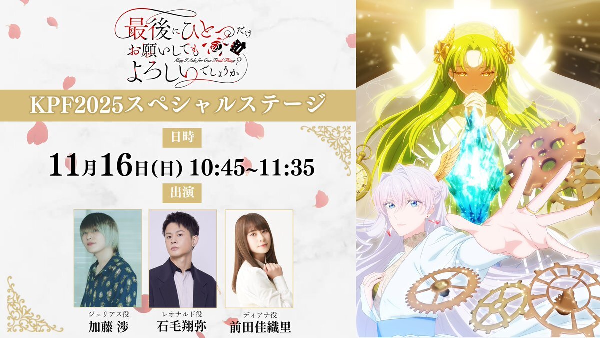 #KPF2025info アパマンショップ KPF2025 supported by いいちこ このあと10:45よりいいちこグリーンステージで「TVアニメ「最後にひとつだけお願いしてもよろしいでしょうか」KPF2025スペシャルステージ」開催です!✨ お楽しみに! 【出演】 #加藤渉 #石毛翔弥 #前田佳織里 #さいひと #KPF2025 pic.x.com/BLY2Z8DTGk