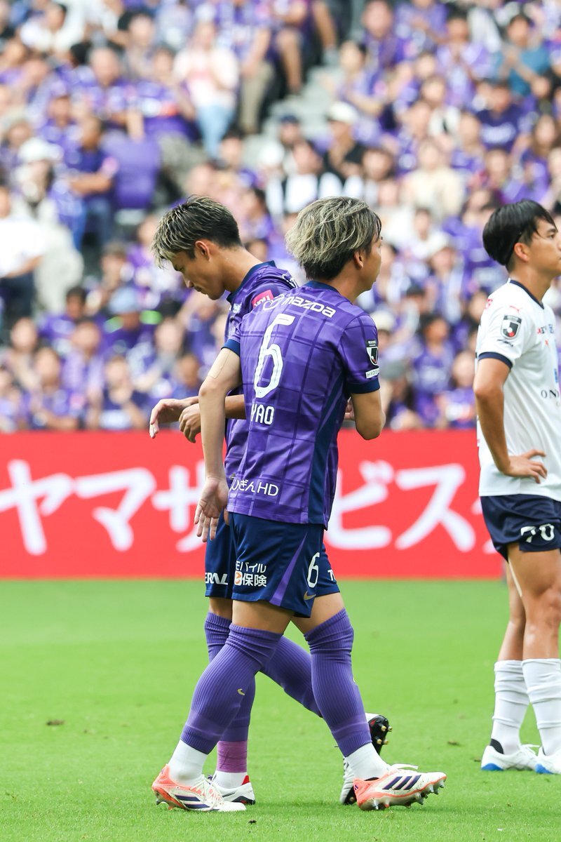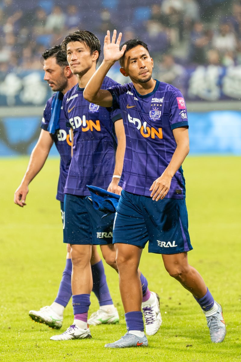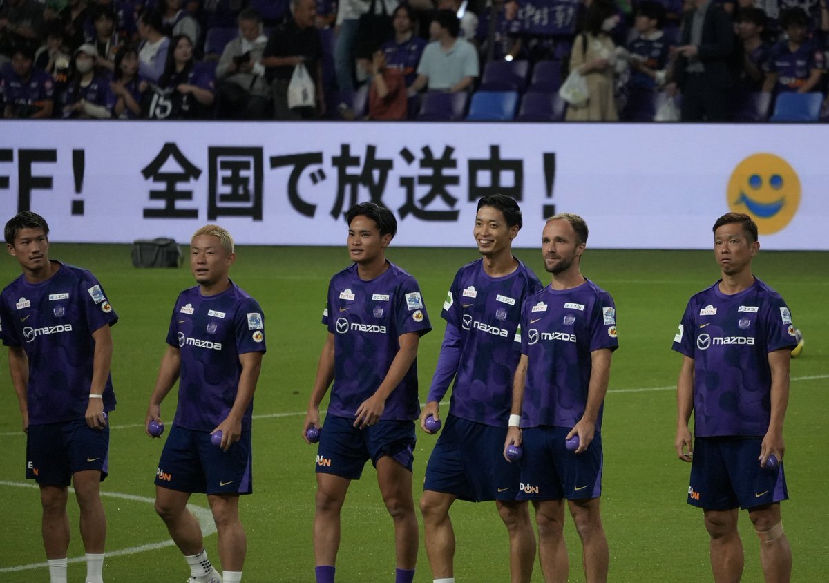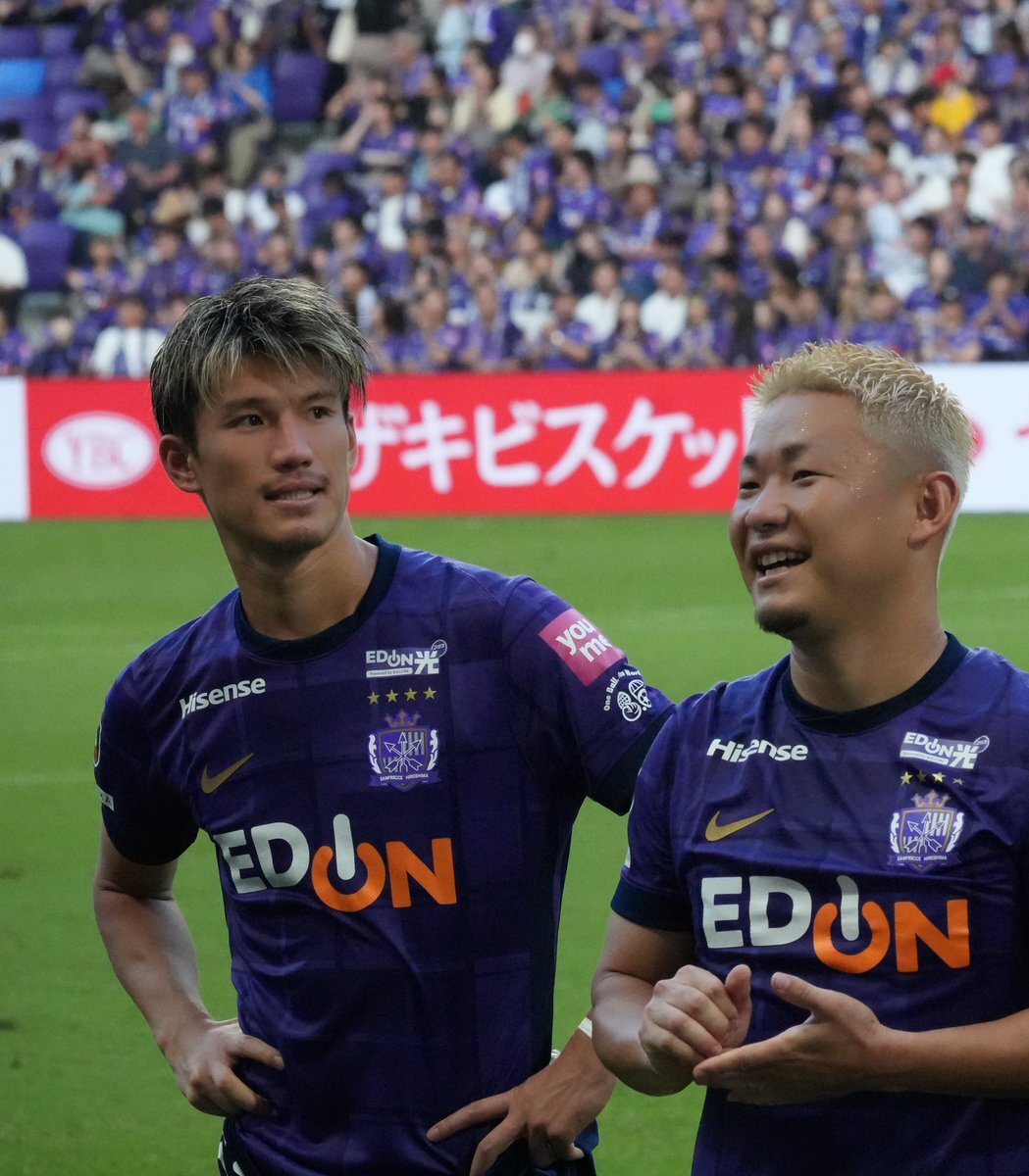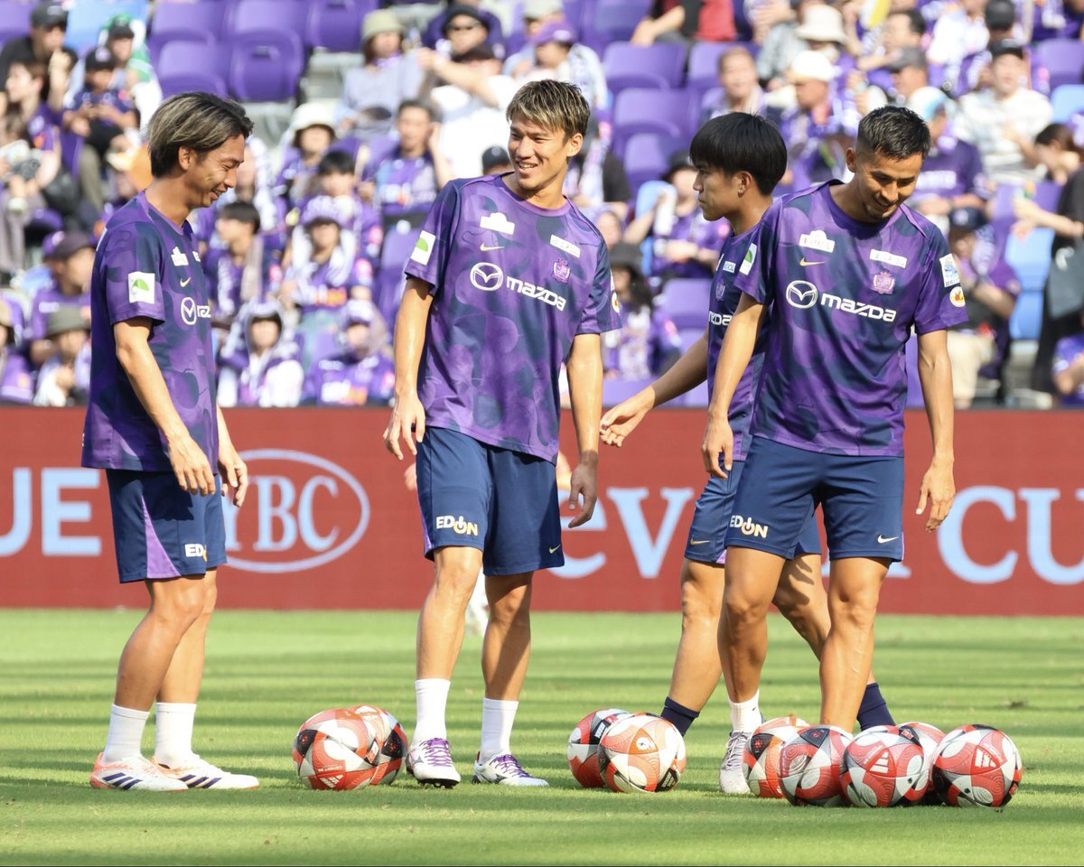 サイン入り弾2個片手持ち、強面構成員の皆さんと両の手で持ち立ち姿が美しい若者 20251012 横浜FC戦 #sanfrecce #塩谷司 選手 #トルガイアルスラン 選手 #菅大輝 選手 #前田直輝 選手 #中島洋太朗 選手