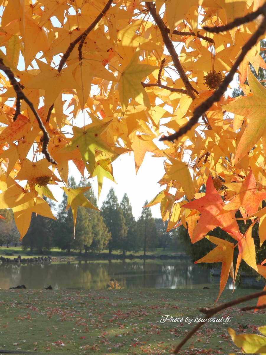 今年の加須市花崎のイチョウ並木。青空に映える黄金色が美しい 次いで #加須はなさき公園 へ モミジバフウは赤く色付き青と赤のコントラストが素晴らしい 同じ敷地内のメタセコイア。淡い茶色が水面に映えてる…かな? イチョウ並木もメタセコイアもこの奥行き感が好き 今年も目の保養になりました pic.x.com/BStzAK4Zuu