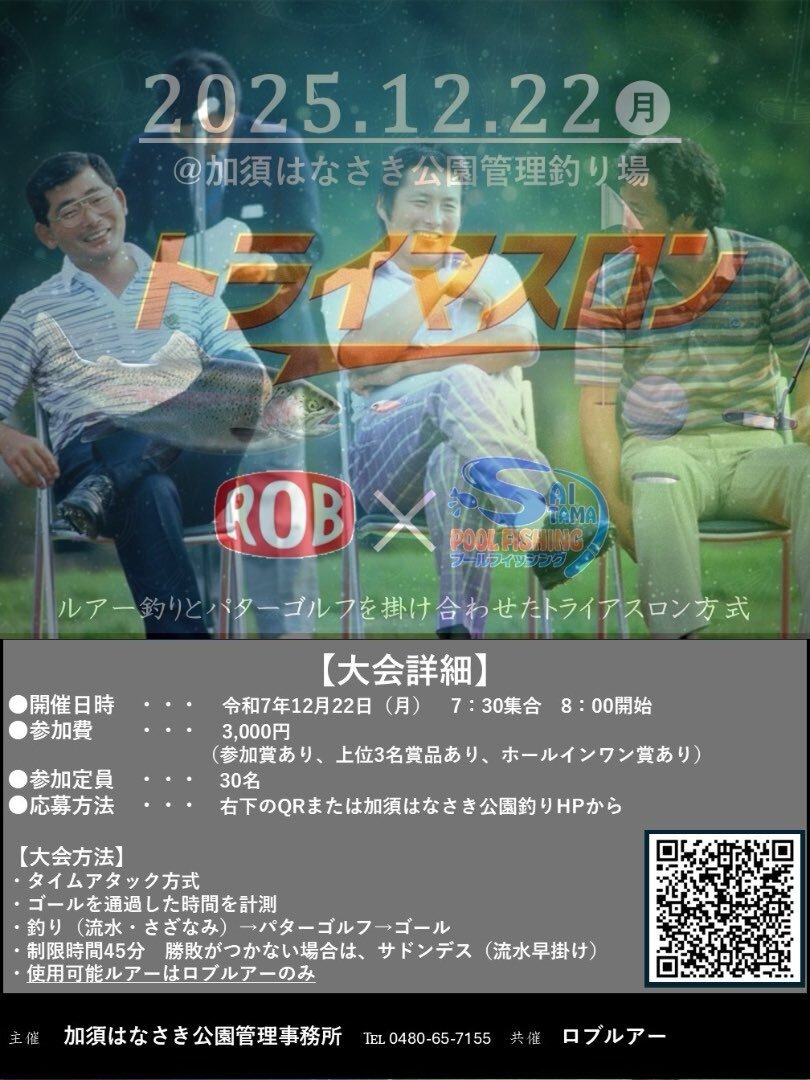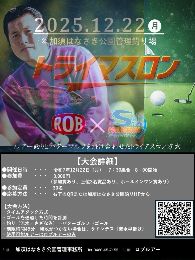 [加須はなさき公園] プールフィッシングイベント第1弾 #トライマスロン2025 12/22(月) ルアー釣りとパターゴルフを掛け合わせたトライアスロン方式の大会を行います! 今大会はロブルアーとの共催です! 応募は11/22(土)12時〜 #プールフィッシング #加須はなさき公園 #管理釣り場 #ロブルアー