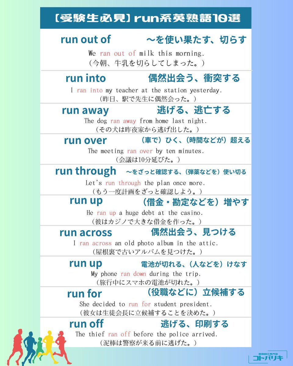 【受験生必見!】 runを含む英熟語10選 英熟語クイズという形で投稿していますが、今回は少し趣向を変えてみました。 例文もセットの方がより覚えやすいか思います。ぜひ活用してください! #関関同立専門塾コトバリキ #勉強垢 #勉強垢と繋がりたい #英熟語 pic.x.com/AQM5f1W37Y