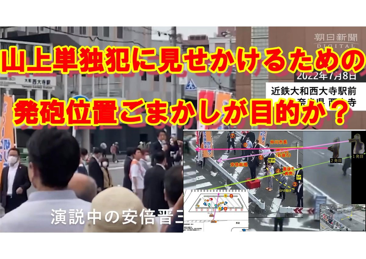 山上単独犯説を崩すには「起点」を まず山上発砲位置の特定が必要 その上で、①福島教授会見内容、②事実(捏造部分を除いた公開映像解析)、③物理から考察すべきと思います 警察やマスコミ検証報道での発砲位置はウソ #安倍暗殺事件 #裁判員裁判 #動画加工 x.com/bunji_inoue/st…