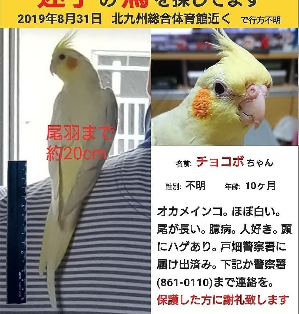 2019.8.31オカメインコのチョコボが迷子に。福岡県内外で25cm位の白系でほっぺがオレンジの鳥を保護された方を知りませんか。SNSとSNSをされてない方への口伝てだけが頼りです。どうか拡散をお願いします #拡散希望RTお願い #迷い鳥 #迷子インコ #迷子オカメ #福岡県 #北九州 #北九州総合体育館