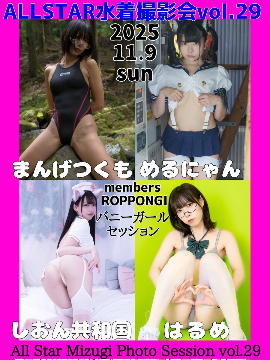 11/9(日)ALLSTAR水着撮影会vol.29 ♥まんげつくも @kumozuke ♥めるにゃん @meru12chai ♥しおん共和国 @mami11191 ♥はるめ @harutan__2608 ★詳細はこちら ameblo.jp/r-3-9/entry-12… ☆お申し込み受付開始は明後日10/21(火)21:00 #グラビア撮影会 #グラビアアイドル #北九州撮影会 pic.x.com/TcuAYnjiAt