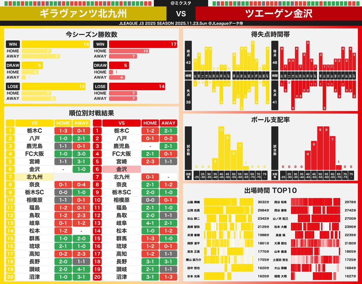 (07/10) 🗓️2025年11月23日(Sun) J3 試合プレビュー画像📊 ➡︎試合前に対戦相手のデータをチェック👀 ギラヴァンツ北九州 vs ツエーゲン金沢 #Jリーグ #北九州金沢 pic.x.com/CctG32z9hz