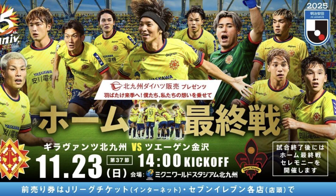 ⬛️ MW37 ギラヴァンツ vs ツエーゲン金沢 ミクスタ 2025/11/23 Sun (Day 1) 14:00 ホーム最終戦 6位金沢とは3 Pts差。ギラが自力で6位を奪い返す最後のチャンスになるかもしれない大事な一戦。1-0 ではダメで 2点差で勝たないと這い上がれない。 #北九州金沢 #ギラヴァンツ pic.x.com/PMdOjxw4Ei