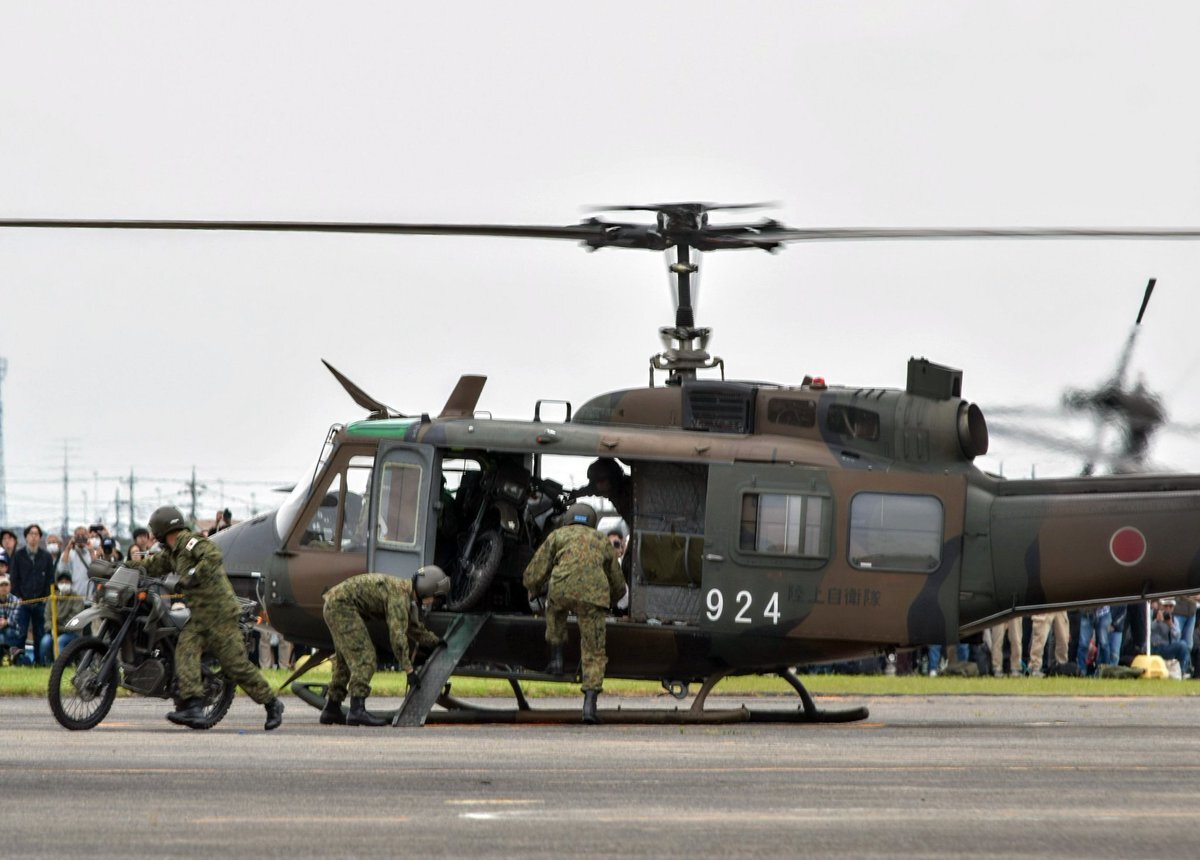 【UH-1J 偵察オート展開】 急降下して着陸、スロープを設置しオートバイを展開する展示です🤔 #北宇都宮駐屯地 pic.x.com/MfjKIZZmx8