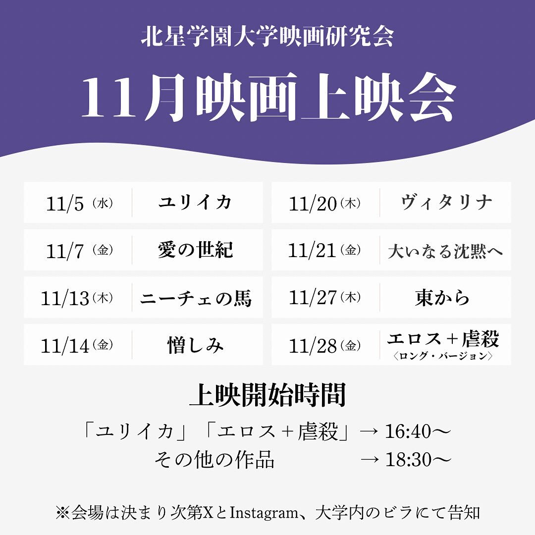 🍁11月🍂の上映会はこんな感じ😼 面白そうな作品が沢山あるな〜😆 興味ある方はぜひ来てください‼️ #北星学園大学 #映画 #映画研究会 #映画上映会 #映画好きと繋がりたい #ペドロ・コスタ好きと繋がりたい #長回し #日本近代批判三部作 #性と政治の季節 pic.x.com/oGlDzxKGtv