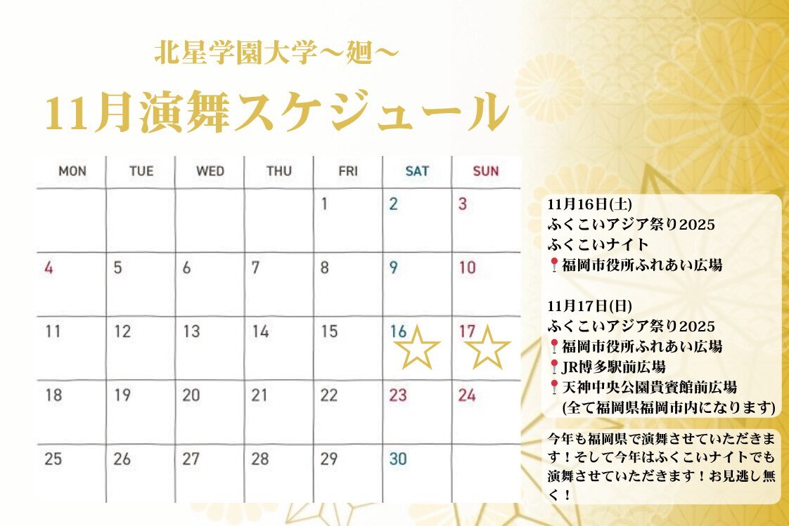 皆さんこんにちは‼️北星学園大学~廻~です💫 さて今回は、11月の演舞スケジュールをお届けします!! 今月は北海道を飛び出して、福岡県で演舞させていただきます! 福岡の皆さまにお会いできるのを心より楽しみにしております😆 #yosakoiソーラン #北星学園大学 #北星学園大学廻 pic.x.com/9HGdmpdKAq