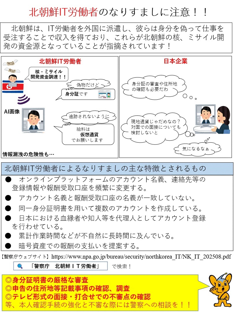 警視庁が、 #北朝鮮IT労働者 によるなりすましに対する注意喚起を投稿している。 x.com/mpd_ccac/statu…