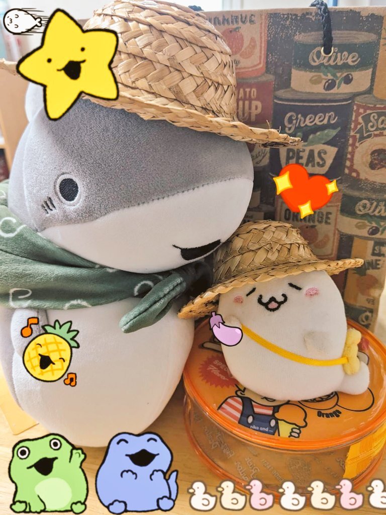 お友達に麦わら帽子をもらったので早速試着🙌 早くもおでかけしたくてワクワクのこざ子ザコンビ✨🍆🦈 来年の夏が待ち遠しいね〜☀🎐☺️ みんなでいっぱいおでかけしよう! #北海の魔獣あざらしさん #おでかけ子ザメ pic.x.com/qDxFOLhzvZ
