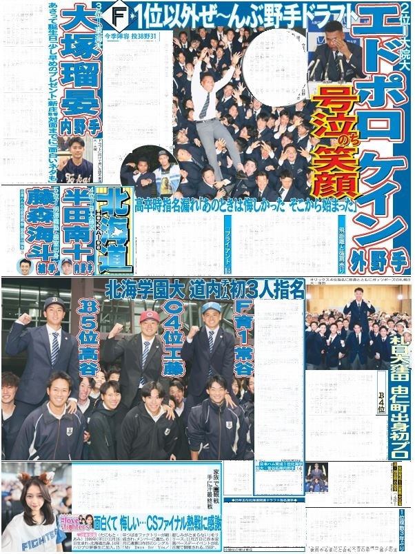 本日の北海道面は 1位以外ぜ~んぶ野手ドラフト 日本ハムドラフト指名2位から5位の選手を紹介 道内チーム初 北海学園大から3人指名 lovefightersは谷本安美さん 面白くて悔しい・・・CSファイナル熱戦に感謝!! #プロ野球ドラフト会議 #北海学園大 #日本ハム #lovefighters #谷本安美 pic.x.com/SkFPP5fTpK