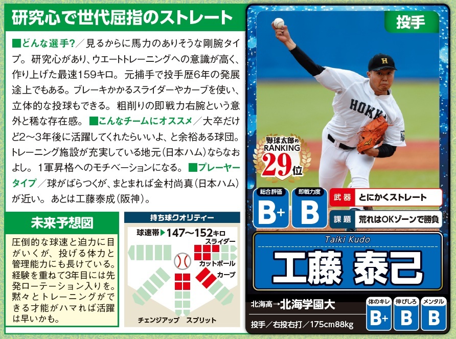 ドラフト会議まであと数時間!『#野球太郎 No.056』ドラフト候補名鑑の注目選手を公開!いまの球界のトレンドにハマる剛球の持ち主 #工藤泰己(#北海学園大)は何巡目でどの球団から指名されるでしょうか!? 本の購入→x.gd/WJrfT #ドラフト会議 #野球太郎トッププロスペクト pic.x.com/soetdZkqdm
