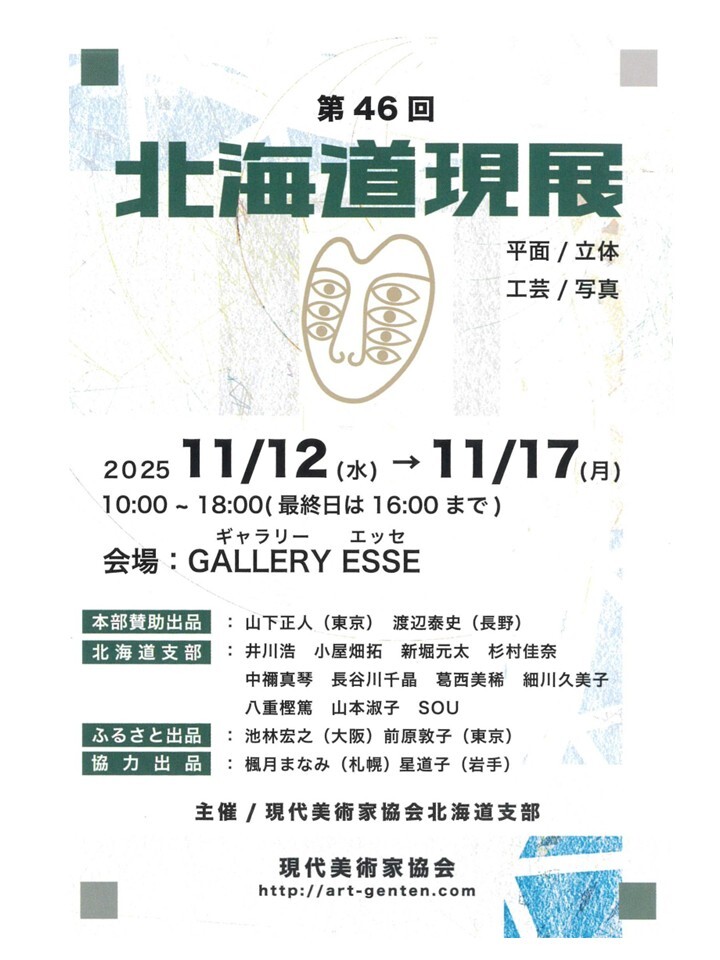 【会員イベント情報】 第46回北海道現展 2025年11月12日(水)~17日(月) 10:00~18:00(最終日は16:00まで) 会場:GALLERY ESSE(ギャラリーエッセ) (札幌市北区北9条西3丁目9-1ル・ノール北9条1階) 主催/現代美術家協会北海道支部 #北海道現展 #ギャラリーエッセ pic.x.com/9FImrkh0x8