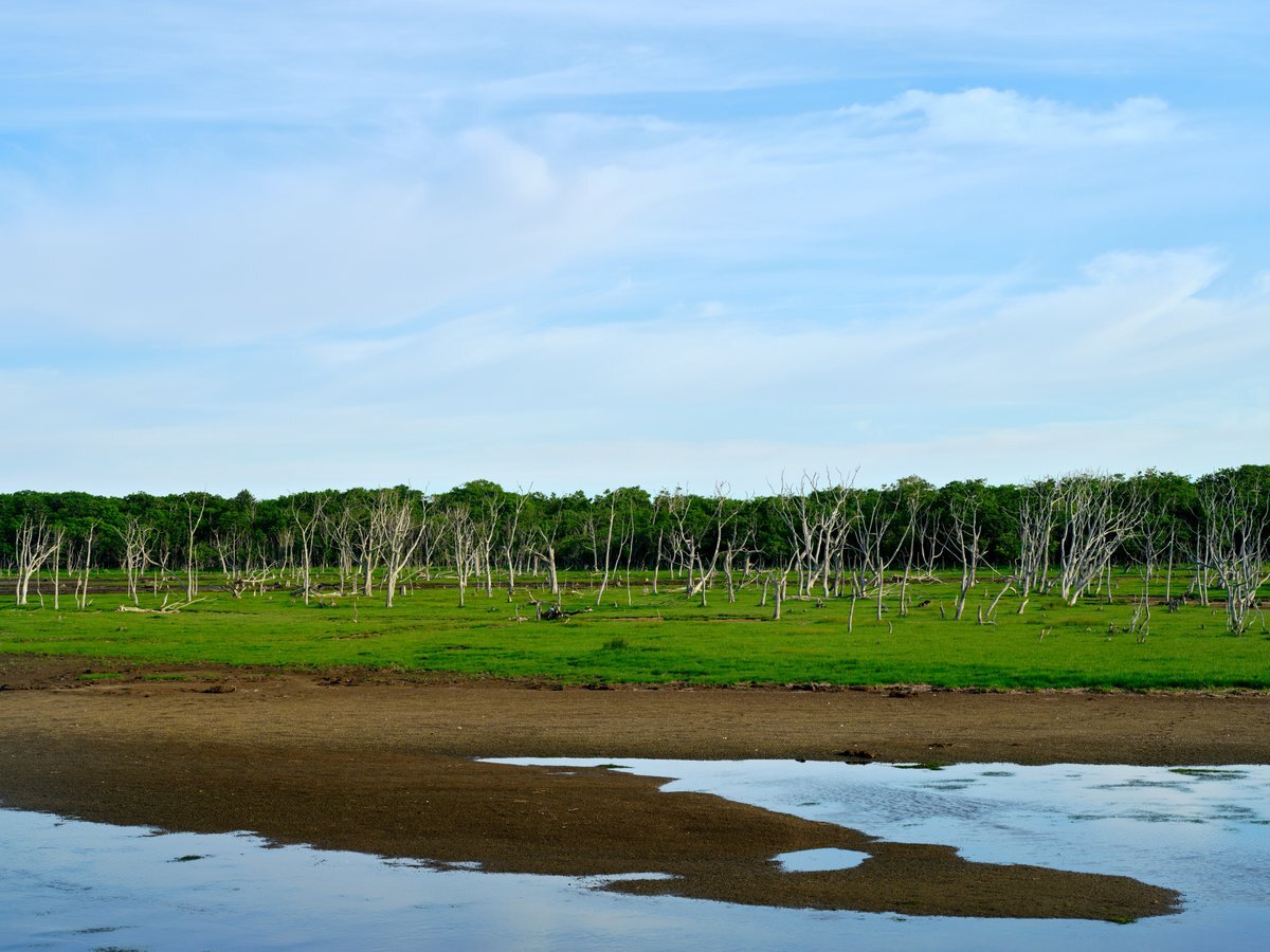 【ナラワラ@別海町】 ナラワラは別海町にある「この世の果て」を感じさせるスポット。 枯れた木々が湿地の上に立ち並ぶ姿は全国的にも珍しい光景です👌 風化した木々達はいずれ倒壊し、何もない湿地になると予想されていることから、「今しか見られない風景」と言われてます。#北海道絶景 pic.x.com/kGXy3DNigP