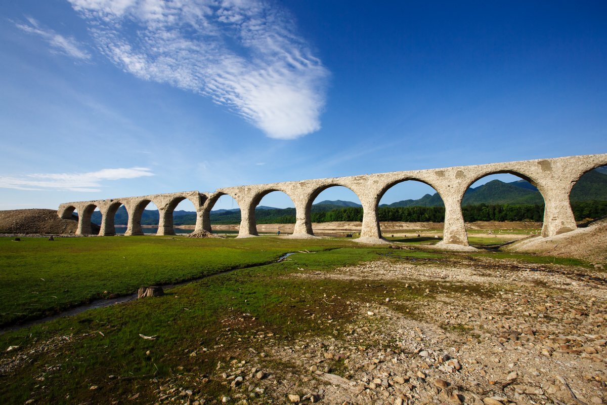 【見え隠れするタウシュベツ川橋梁@上士幌町】 1937年に完成した長さ130mのコンクリートアーチ橋。 例年1月頃になると姿を表し、水位が上昇する5月頃から徐々に沈み始め、夏頃になると完全に湖に沈んでしまう。 季節によって姿が見え隠れするアーチは全国でここだけ👍#北海道絶景 pic.x.com/z5ZX43o0wx