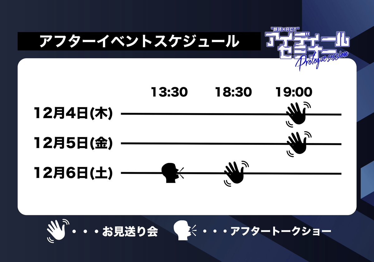╭━━━━━━━━━━━━━╮ #アイディールセミナー Prologue session アフターイベントのお知らせ ╰━━━━━━v━━━━━━╯ ◆アフターイベントの開催が決定いたしました‼ 《開催日程》 12月4日(木)①19:00 《お見送り会》 12月5日(金)②19:00 《お見送り会》