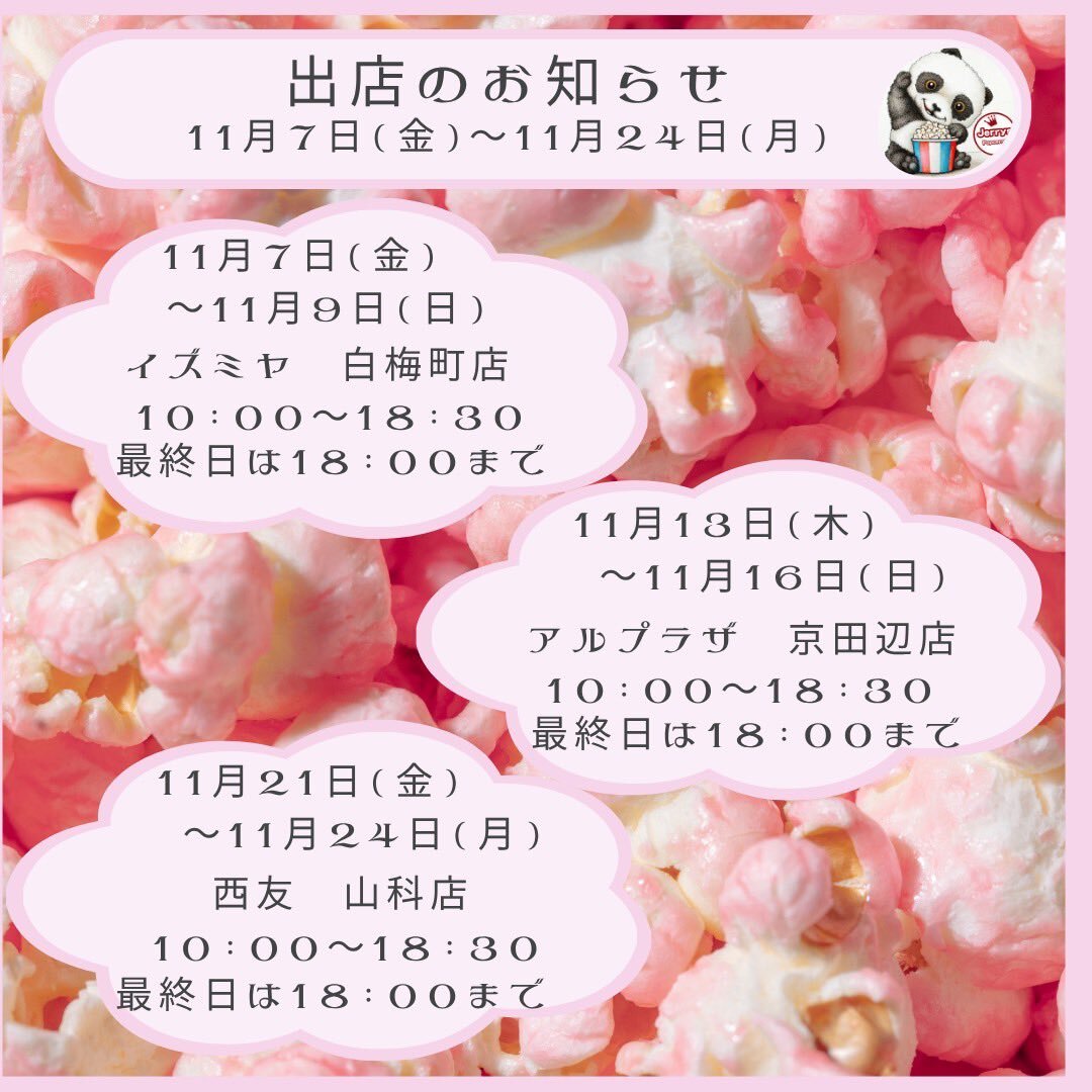 明日から日曜日までイズミヤ白梅町店にて出店です🐼 いつもと場所が違います🍿 1階食品サービスカウンター横にいます🐼 #イズミヤ白梅町店 #イズミヤ #ジェリーズポップコーン #ポップコーン屋さん #京都 #京都市 #北野白梅町 #ラスカル #3時のおやつ #ポップコーン好きと繋がりたい pic.x.com/MMoprqYGm2
