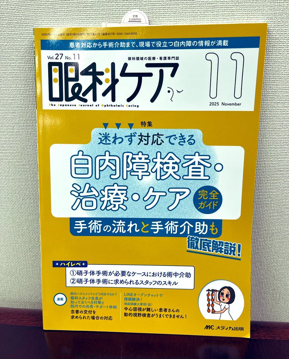 眼科ケア11月号は、白内障検査・治療・ケア完全ガイド。手術の流れと手術介助も徹底解説!ハイレベには硝子体手術登場!@gankacare_mc #眼科 #開業眼科 #スタッフ教育 #日帰り手術 #医療安全 #患者説明 #視能訓練士 pic.x.com/kvK9Vl8YWP