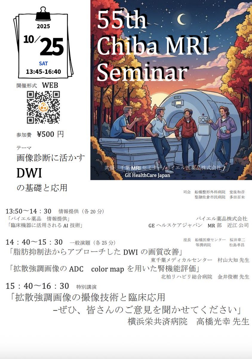 🎓【第55回 千葉MRIセミナー】 🗓10/25(土) 13:45~16:40(WEB開催) 💡テーマ:画像診断に活かすDWIの基礎と応用 💰参加費:500円 👨‍🏫講演:村山大知、金井俊樹、高橋光幸 ほか #MRI #DWI #放射線技師 #医療セミナー #千葉MRIセミナー #拡散強調画像 #医療技術 pic.x.com/s67PipgOTY