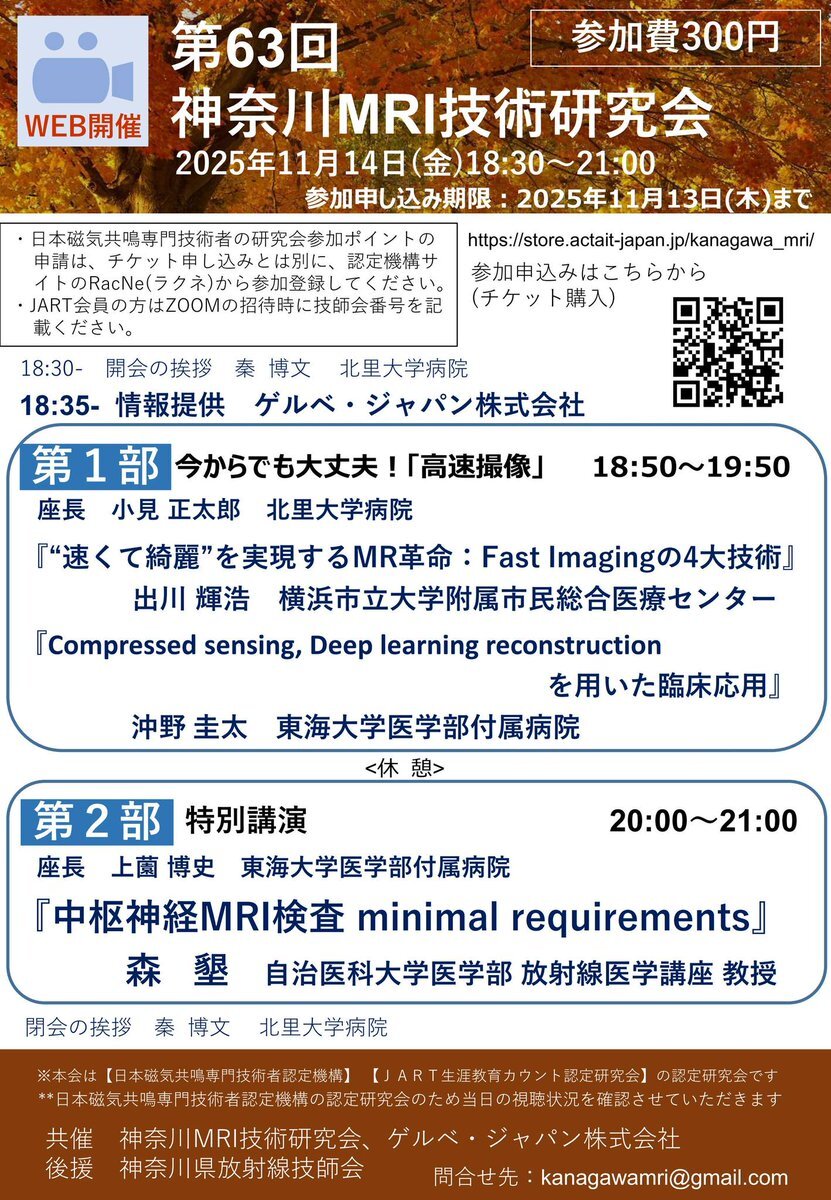 🌀【第63回 神奈川MRI技術研究会】 11月14日(金)18:30〜 WEB開催📡 テーマは「高速撮像」&「中枢神経MRI検査」🧠 “速くて綺麗”を実現する技術と必見の実践講演をお届けします! #MRI #放射線技師 #神奈川MRI #高速撮像 #CompressedSensing #DeepLearning #中枢神経MRI #技術研究会 #医療技術 pic.x.com/oNpjQKA6wy