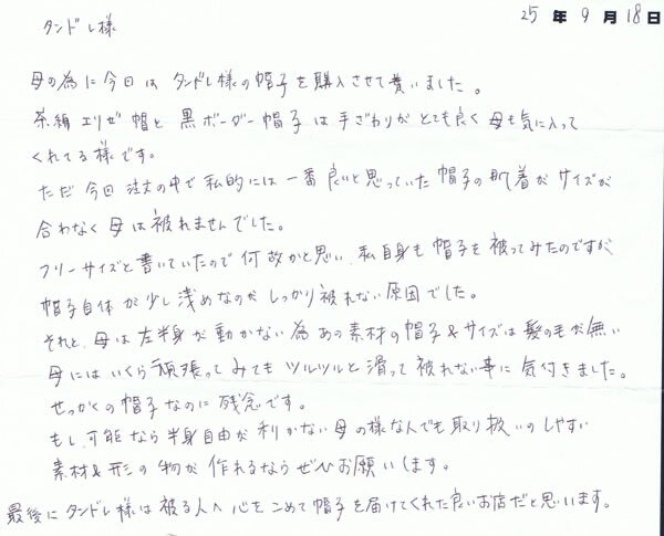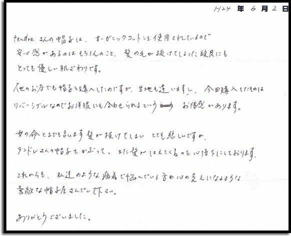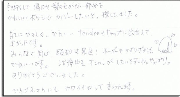 「女の命とまでも言います髪の毛が抜けてしまいとても悲しいですがタンドレさんの帽子をかぶって、また髪がはえてくるのを心待ちにしています」 malie様からのお声です 「私達のような病気で悩んでいる方の心の支えになるような素敵な帽子屋さんでいて下さい」 #医療用帽子 tendre.org/hpgen/HPB/entr… pic.x.com/vsgD541S1N