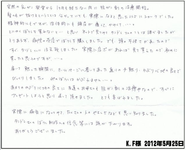 「タンドレ様は被る人へ心をこめて帽子を届けてくれた良いお店だと思います」 ハナ様からのお声です 商品が合わなかったご意見も真摯に受け止め改良を続けています tendre.org/hpgen/HPB/entr… #医療用帽子 #抗がん剤治療 #オーガニックコットン #抗がん剤帽子 #ケア帽子 #QOL pic.x.com/r5W7E8aEaq