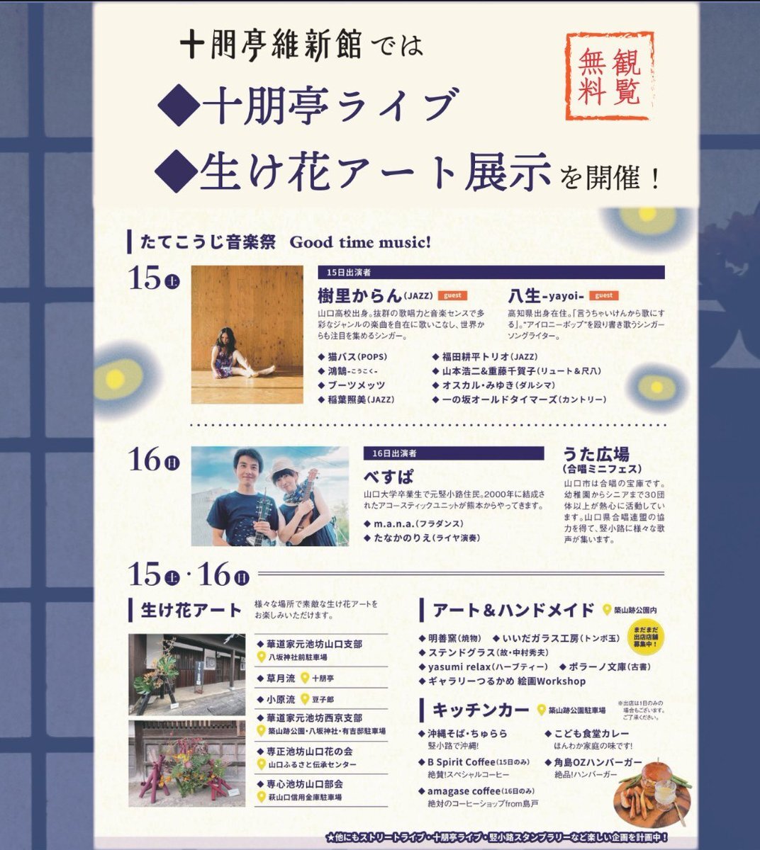 【たてこうじ音楽祭】11/15(土)・11/16(日) 山口市竪小路のあちらこちらで音楽とアート鑑賞ができます! #十朋亭維新館 の敷地内でもライブや生け花アートを楽しめますよ~♪ ☺️🎨🎻🌼ぜひお出かけください! pic.x.com/FjiMIMuqVy