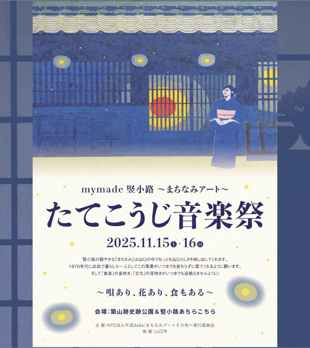 【たてこうじ音楽祭】11/15(土)・11/16(日) 山口市竪小路のあちらこちらで音楽とアート鑑賞ができます! #十朋亭維新館 の敷地内でもライブや生け花アートを楽しめますよ~♪ ☺️🎨🎻🌼ぜひお出かけください!