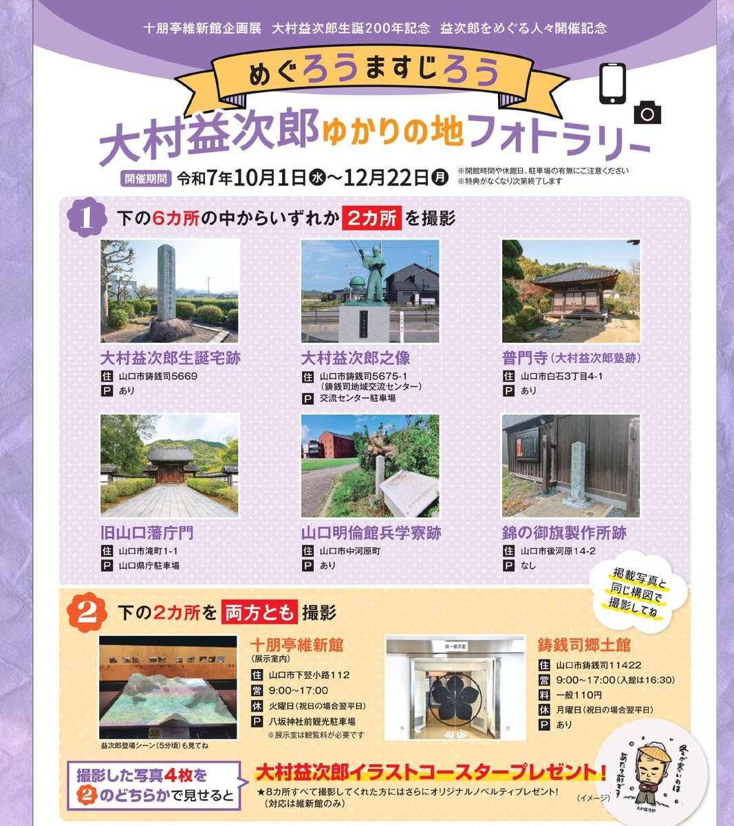 【大村益次郎の足跡をめぐろう!👣】 #十朋亭維新館 フォトラリー 〜撮影スポット〜 ●十朋亭維新館 ★必須 ●鋳銭司郷土館 ★必須 + 【↓以下から2カ所以上】 ○大村益次郎生誕宅跡 ○大村益次郎之像 ○普門寺 ○旧山口藩庁門 ○山口明倫館兵学寮跡 ○錦の御旗製作所跡 ぜひどうぞ~!😉 pic.x.com/a9zOte2Ajs x.com/jippotei0929/s…