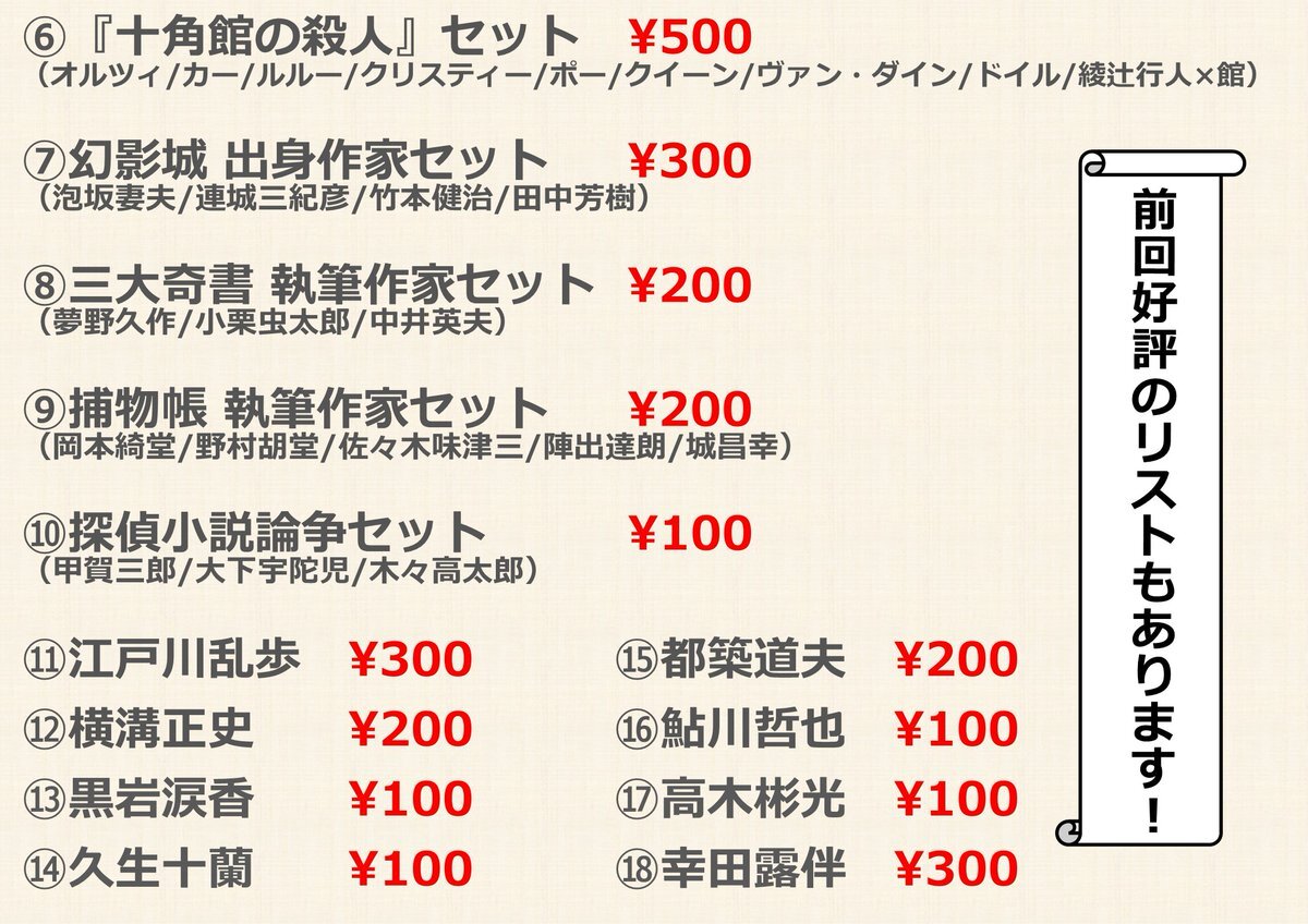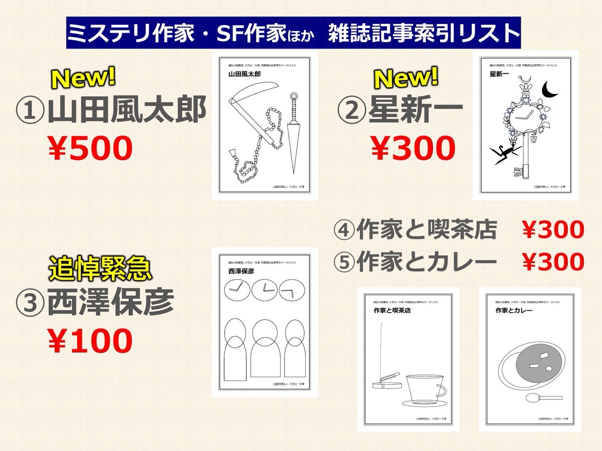 文学フリマにて作家(ミステリ作家多め)に関する雑誌記事索引リストを頒布します! 新作以外には、 #十角館の殺人 #幻影城 #三大奇書 各セットや #江戸川乱歩 #横溝正史 など、他にも #鬼滅の刃 #大正の世相 #少年ジャンプ などのリストもご用意! ブース:H-91〜92 #文学フリマ東京 #文学フリマ pic.x.com/rRKr7JmVHp