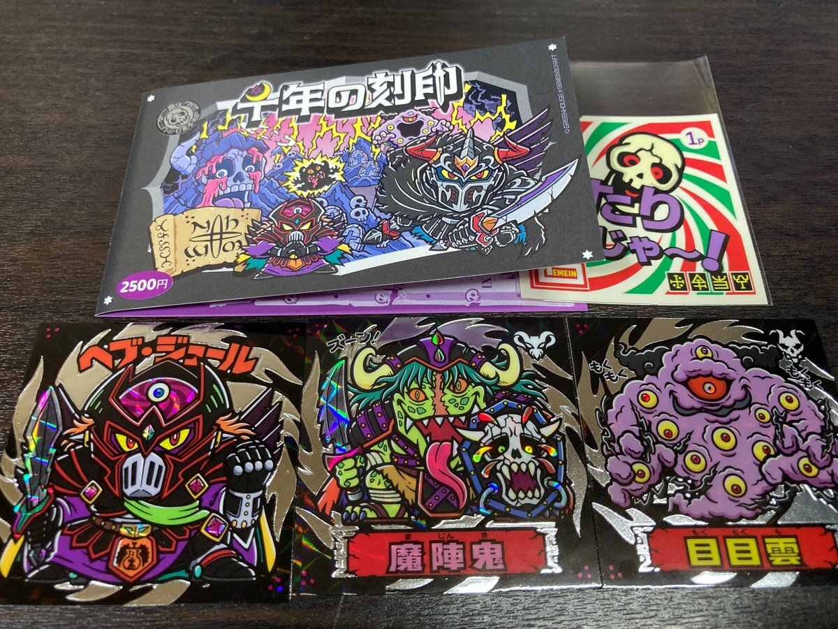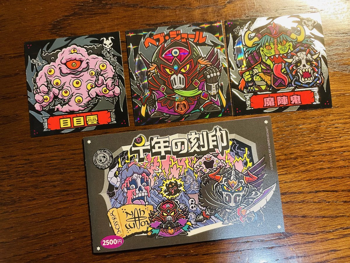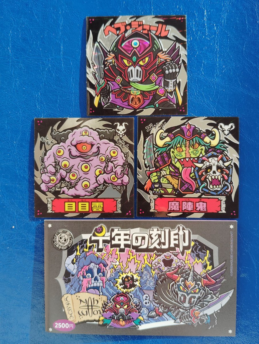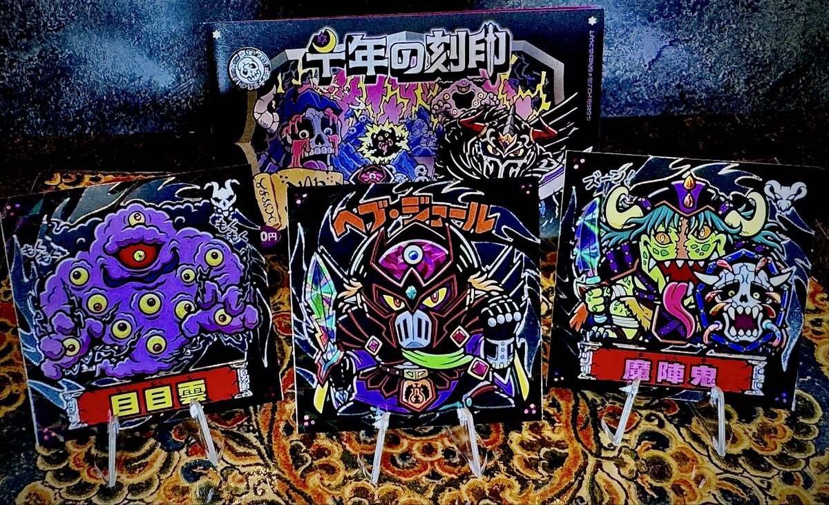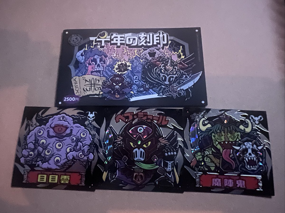 【千年の刻印】ドォルキー・モーの配下が届きました✨️今回も三者三様の魅力が詰まっていますね😁 @Gemein_schaft_ さんこれからも楽しみにしています〜😊 #ビックリマン #ひろひろのビックリマン #千年の刻印 #ゲマインシャフト pic.x.com/0AmLofR3Mm
