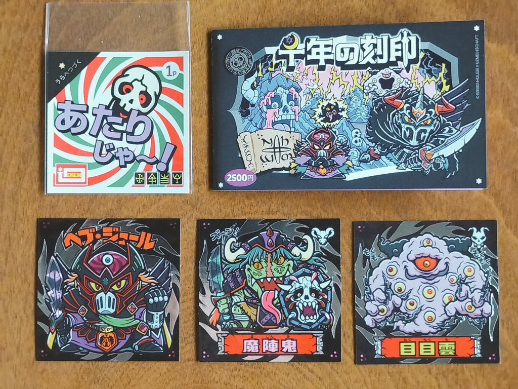 楽しみにしていた千年の刻印開封 パケで雷に打たれてる魔陣鬼君がいい味出してる⚡ アルミのような質感の箔押し(?)なのかな すごいシールや… #ゲマインシャフト #千年の刻印 pic.x.com/9evoJU8Z2D