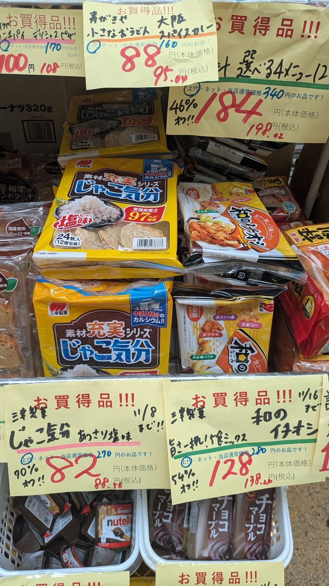 こんにちわ!ワケア千林店です🐱 💮カイロ 🔵ネット498円が 🉐220円 💮ピーナッツせんべい 🔵上代150円が 🉐108円 💮和のいちおし 🔵上代280円が 🉐138円 💮じゃこ気分 🔵上代270円が 🉐88円 ぜひ、ワケア千林店へ。 #千林 #千林商店街 #わけあり pic.x.com/5tQpZS5DPG