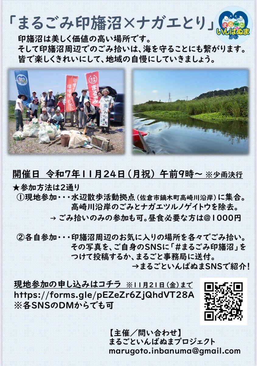 #千葉県まるごとゴミ拾い の最終開催は印旛沼です。#まるごといんばぬまプロジェクト が賛同参加して11月24日(月)にゴミ拾いと #ナガエツルノゲイトウ の除去作業を9時スタートで行います。参加申込は明日21日(金)まで! 詳しくは marugomi.jp/1124chibamaru_… pic.x.com/vkzXqeMMHM