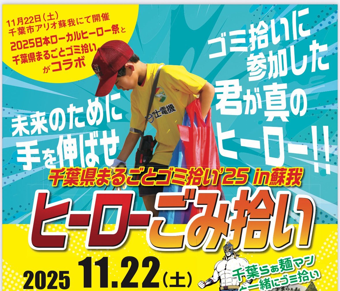 2025年11月22日(土)千葉市の #アリオ蘇我 にて『#ヒーローゴミ拾い』開催 12時45分集合、13時スタート、 #千葉らぁ麺マン 参加! #拾ったゴミはお菓子になる! #鳳神ヤツルギ が待ってます! #まるごみ #千葉県まるごとゴミ拾い 詳しくは→ marugomi.jp pic.x.com/qgj36elzcq