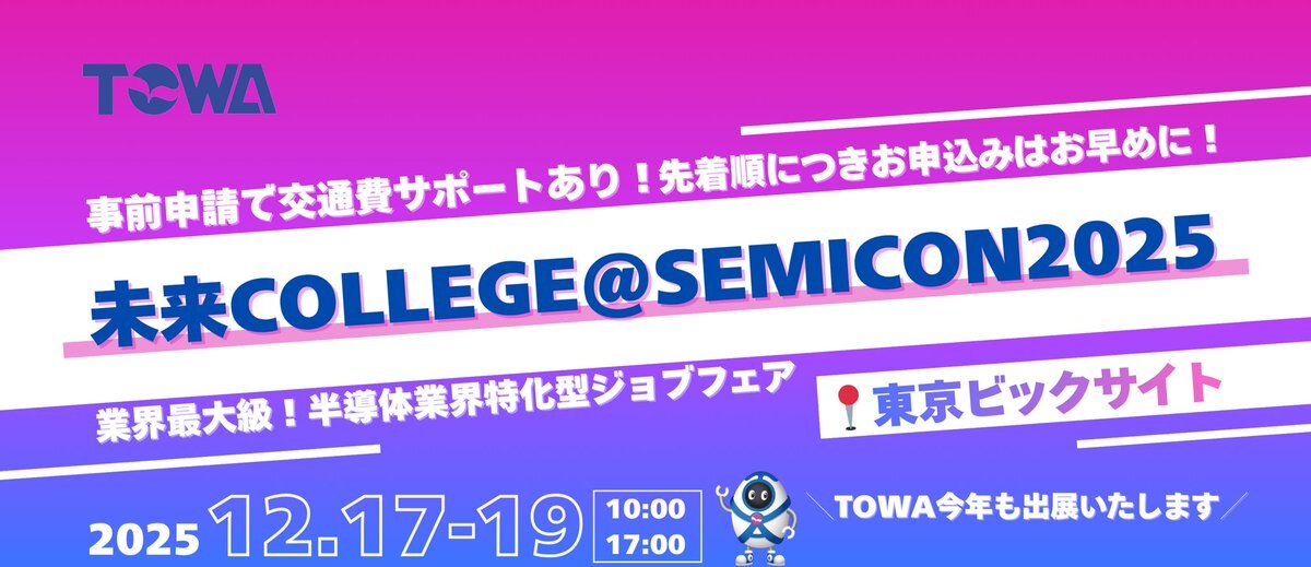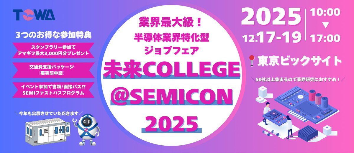業界最大級! 半導体業界特化型ジョブフェア 未来COLLEGE@SEMICON2025に 今年もTOWA出展させていただきます🌟 #TOWA #TOWA株式会社 #半導体 #半導体製造装置 #半導体業界 #業界研究 #未来COLLEGE #SEMICON2025 #東京ビックサイト #新卒採用 #27卒 #27卒と繋がりたい semijapanwfd.org/event/jobfair/… pic.x.com/OQ7TEhEUrI