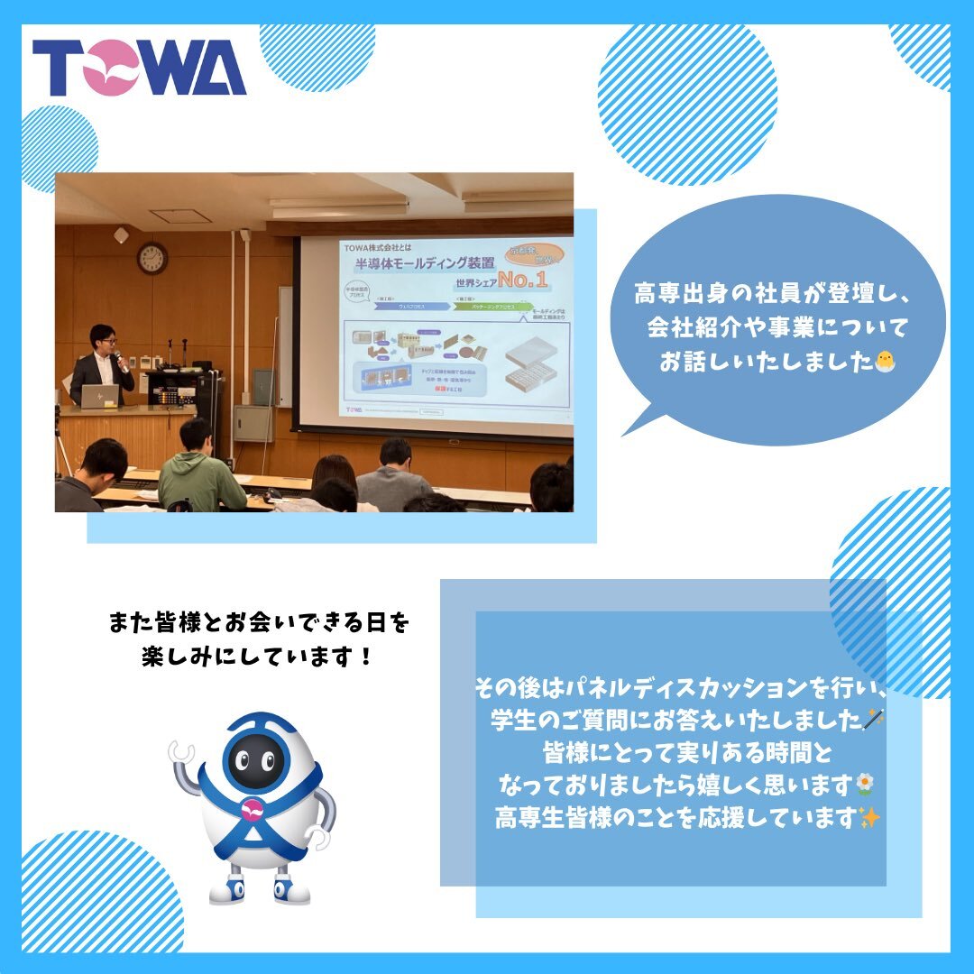 先日、日本半導体製造装置協会(SEAJ)主催の出前授業で舞鶴高専さんにおじゃましました🌟 そちら様子を掲載いただいております👀 ありがとうございました🌼 #TOWA #TOWA株式会社 #半導体 #半導体製造装置 #日本半導体製造装置協会 #SEAJ #出前授業 #舞鶴工業高等専門学校 maizuru-ct.ac.jp/life/2025/10/2…