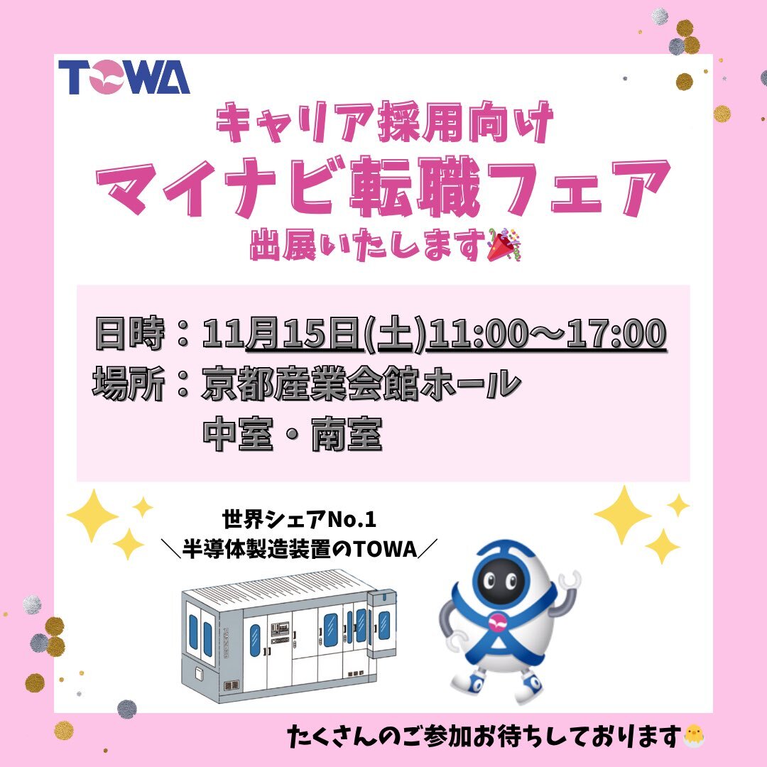 🌟キャリア採用情報🌟 『マイナビ転職フェア』にTOWAが出展いたします👀🎶 日時:11月15日(土)11時~17時 転職をお考えの方いらっしゃいましたら、お待ちしております😊 #TOWA #TOWA株式会社 #半導体 #半導体製造装置 #マイナビ転職フェア #マイナビ転職 #キャリア採用 #中途採用 #転職 #キャリアアップ