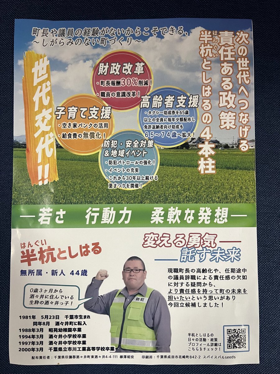 いよいよ選挙活動スタート! 若さと行動力で酒々井町を前へ。 「世代交代」「次の世代へ託す未来」 実現に向けて全力で走ります! 応援よろしくお願いします! #酒々井町 #町長選 #半杭としはる pic.x.com/cNzPYmDi6a