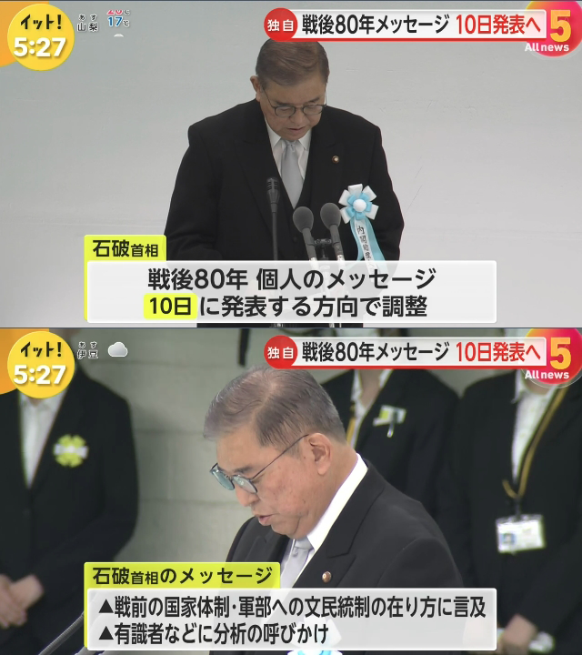 【戦後80年個人見解、10日発表へ】石破茂総理大臣の『戦後80年、個人のメッセージ』を10日に発表する方向で調整。戦前の文民統制の在り方や有識者などに分析の呼びかけなどのメッセージだという…