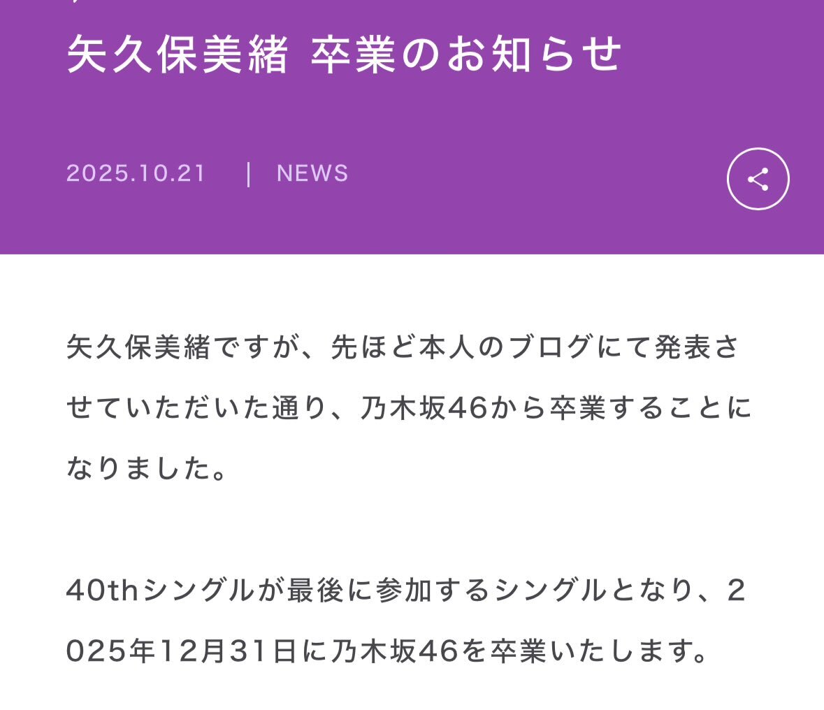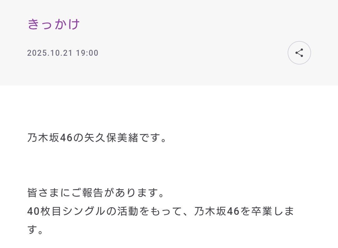 乃木坂46・矢久保美緒、12月末で卒業発表...「選抜を経験してほしかった」と惜しむ声相次ぐ rbbtoday.com/article/2025/1… #エンタメ #乃木坂46 #卒業発表 #矢久保美緒 #矢久保ちゃん