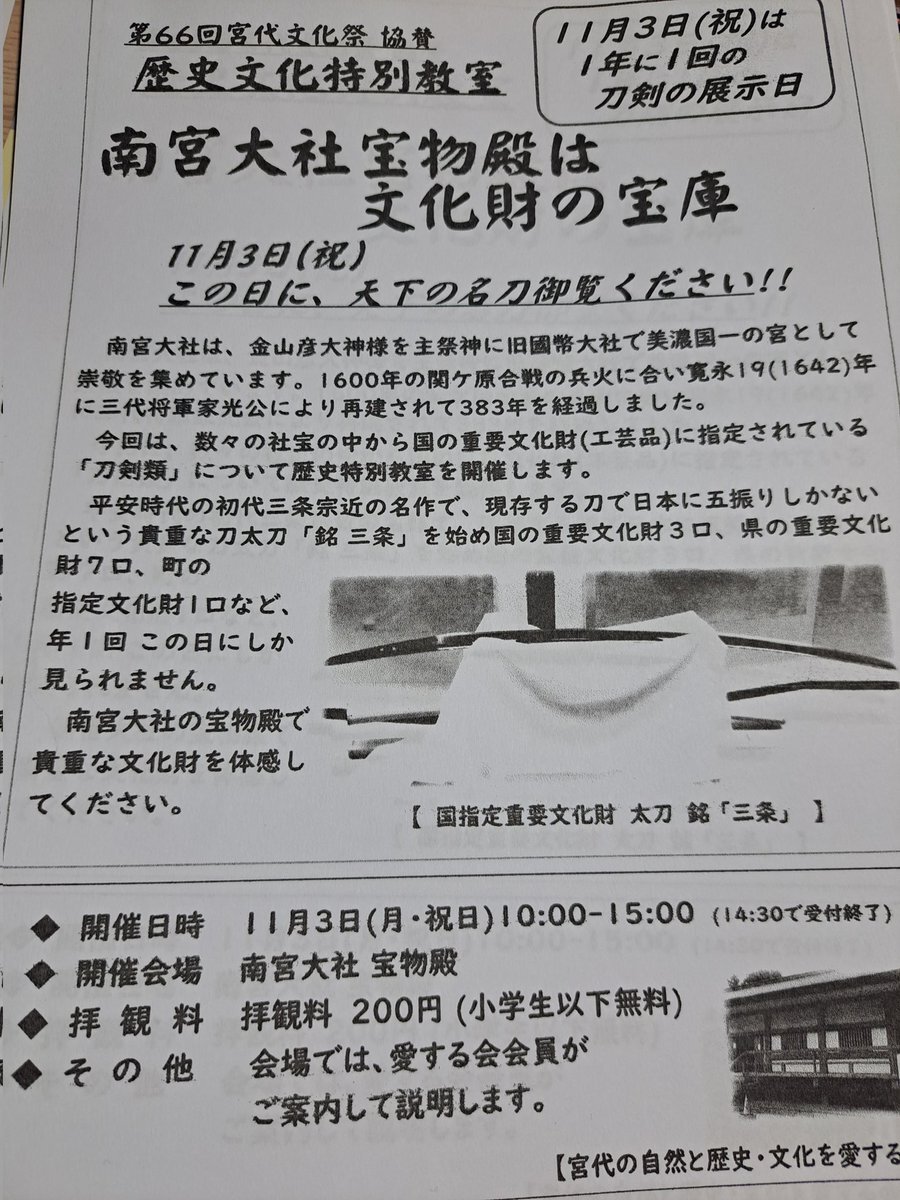 【助さん拡散】 毎年11月3日に #南宮大社 の宝物殿が開れ #三条宗近 も公開される。あの #三日月宗近 の現存する5兄弟のうちの一振! 他にも #孫六兼元 #二代目兼定 奉納と伝わる矛も! 前日は #石田三成2025 も開催されるゆえ1日足を伸ばしてきてみて! nangu-san.com/about/swords.h… pic.x.com/XQoK094EtR x.com/nangutaisha1/s…