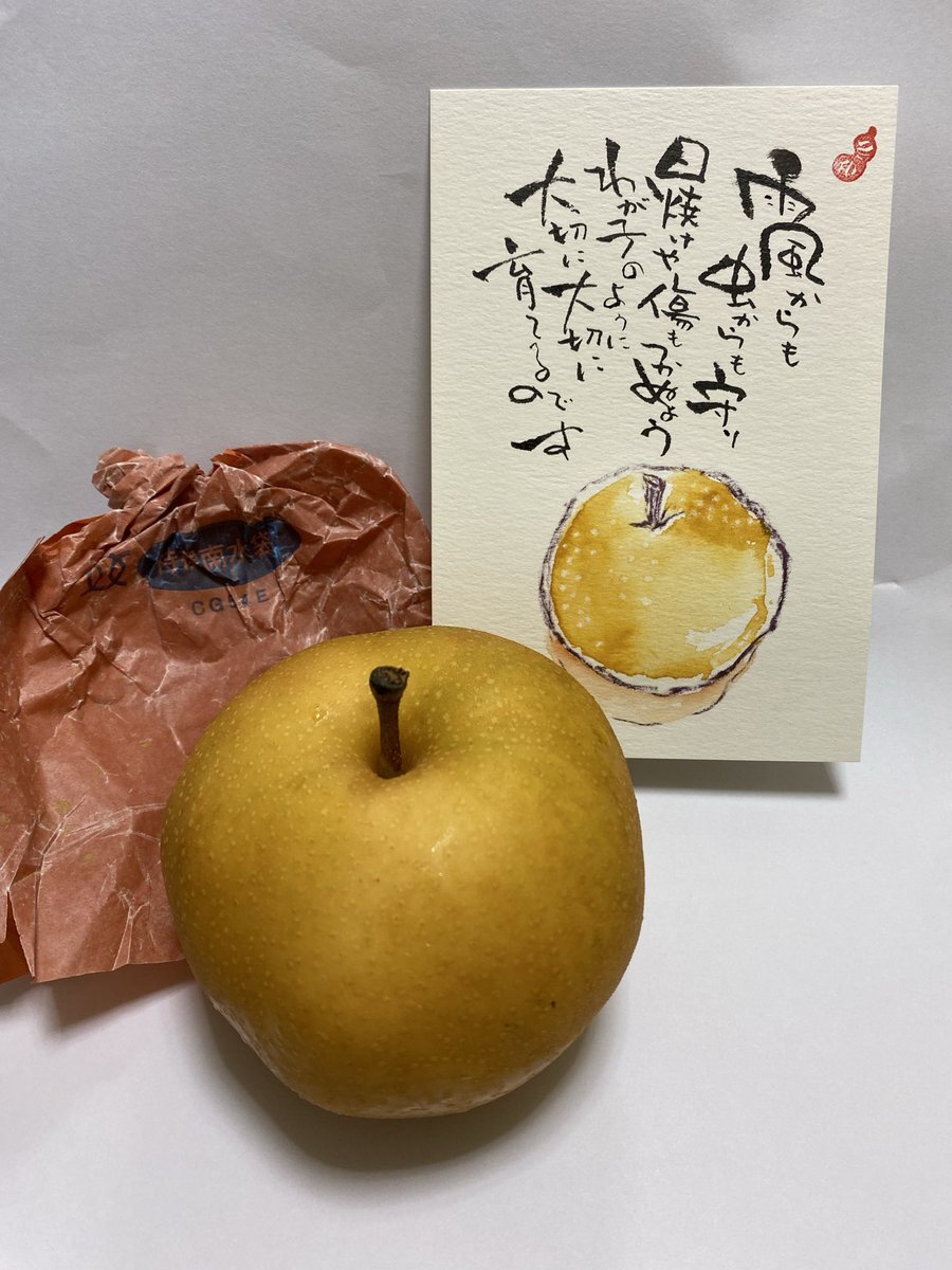 昨日 姉から南水梨をもらいました 昔は油紙 梨農家さんが 虫に負けるな 雨風に負けるな 日焼けのない 器量よしに育ちなさい と声をかける姿が目に浮かびます ひとつ ひとつ 人の手で 袋をかける南水袋 手間暇かけて 愛情かけて と推敲する #己書 #南水梨 #特撰南水袋 #南水 # #袋かけ pic.x.com/VExLL6kZJo