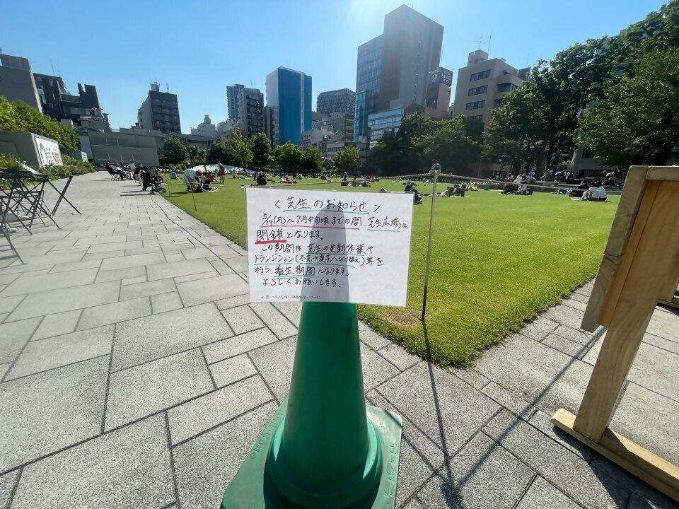 【芝生養生期間のお知らせ】🍃🍃 #南池袋公園 のシンボルとなっている #芝生 ですが、冬芝(ペレニアルライグラス)から夏芝(ティフトン)へ切り替えるため、5月19日(月)から7月17日(木)まで全面閉鎖となります。 開放日が変更になる場合は、SNSおよび豊島区ホームページでお知らせします。 pic.x.com/X5GMSwGCpA