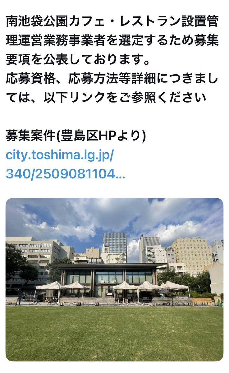 #南池袋公園 カフェ・レストランの事業者のプロポーザル実施について☕️ 南池袋公園カフェ・レストラン設置管理運営業務事業者を選定するため募集要項を公表しております。 応募資格、応募方法等詳細につきましては、以下リンクをご参照ください 募集案件(豊島区HPより) city.toshima.lg.jp/340/2509081104… pic.x.com/36bZiiE5Uw